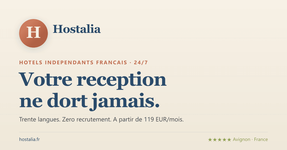 Parce qu'on ne sous-traite pas le serveur, qu'on rédige nos propres prompts dans le ton de l'hôtellerie française, et qu'on garde une équipe qui répond quand ça déconne. À 119 €/mois, vous récupérez ~14h/semaine — soit le coût d'1h30 de réceptionniste.
